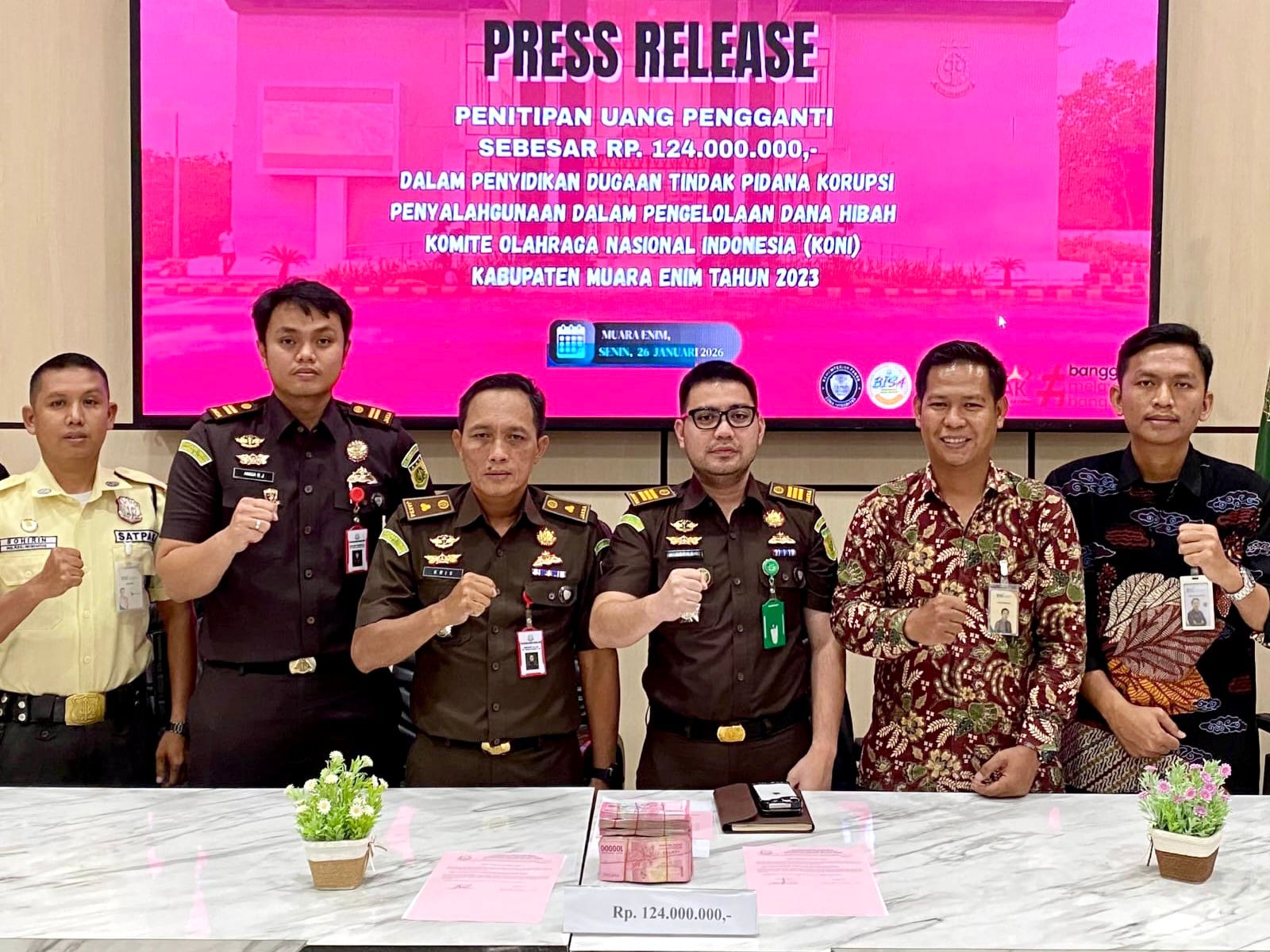 enimpost.com,MUARAENIM – Kejaksaan Negeri (Kejari) Muara Enim terus menunjukkan komitmen kuat dalam penegakan hukum yang profesional dan berorientasi pada pemulihan kerugian keuangan negara. Dalam penyidikan dugaan tindak pidana korupsi penyalahgunaan pengelolaan dana hibah Komite Olahraga Nasional Indonesia (KONI) Kabupaten Muara Enim Tahun 2023, Kejari Muara Enim menerima penitipan uang pengganti sebesar Rp124 juta.
