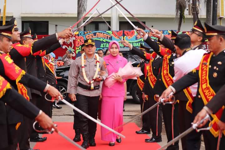 Enimpost.com,MUARA ENIM – Tradisi Pedang Pora, saat berlangsungnya penyambutan Kapolres Muara Enim AKBP Jhoni Eka Putra, SH, SIK, MM, dan istri, serta pelepasan mantan Kapolres AKBP Andi Supriadi, SH, SIK, MH, dan istri di Halaman Mapolres Muara Enim, Rabu (3/1/2024).