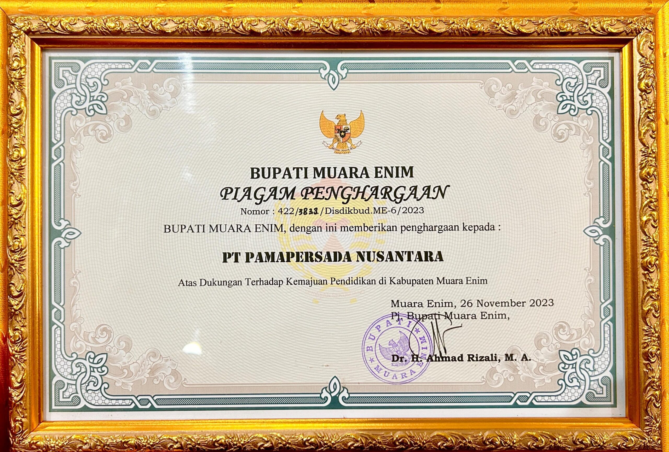 Enimpost.com,MUARA ENIM – Dinilai mendukung kemajuan pendidikan daerah, PT Pamapersada Nusantara (PAMA) Cluster SSBA mendapat apresiasi Pemerintah Kabupaten Muara Enim berupa piagam penghargaan tahun 2023. Penghargaan itu diberikan PJ Bupati Muara Enim, Dr H Ahmad Rizali MA melalui Sekretaris daerah, Ir Yulius MSi pada Senin malam (27/11/2023) di Balai Agung Serasan Sekundang (BASS) Muara Enim.