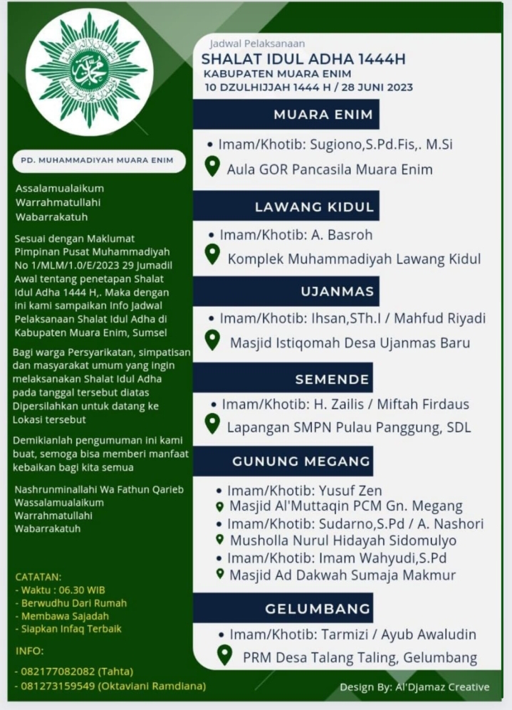Perlu diketahui secara rinci lokasi pelaksanaan Shalat Idul Adha, Imam serta khatibnya sesuai dengan edaran Pimpinan Daerah Muhammadiyah Kabupaten Muara Enim sebagai :