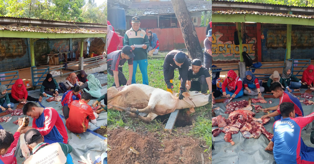 enimpost.com,MUARAENIM,- SMA Bukit Asam (SMABA) Tanjung Enim menyembelih dua ekor sapi kurban pada Senin (9/6/2025) di lingkungan sekolah. Hewan kurban tersebut berasal dari sumbangan guru dan karyawan, dan kegiatan ini melibatkan siswa secara aktif dalam proses penyembelihan hingga pembagian daging.