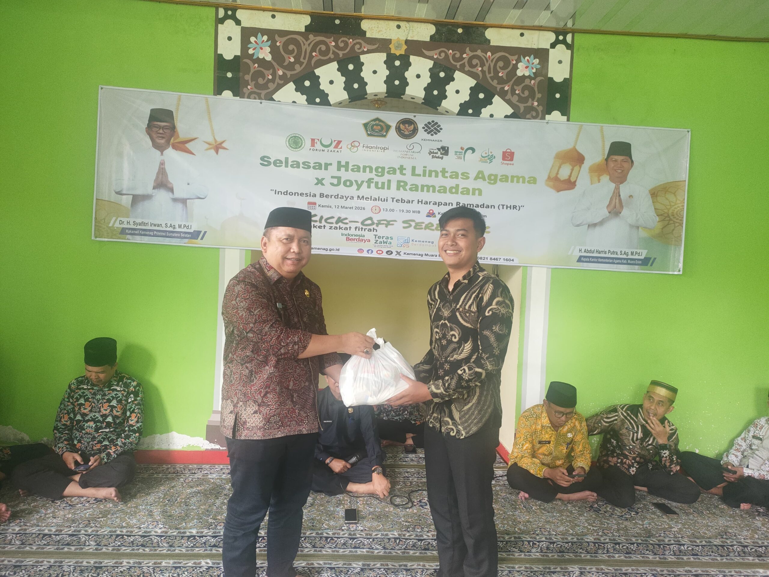 Kegiatan diawali dengan penyerahan santunan secara simbolis oleh Kepala Kantor Kementerian Agama Kabupaten Muara Enim, H. Abdul Harris Putra, di Musala Kantor Kemenag Muara Enim. Penyaluran bantuan ini menjadi bagian dari gerakan nasional “Kick Off Serentak 2 Juta Paket Zakat Fitrah untuk Keluarga Indonesia” yang diinisiasi oleh Kementerian Agama RI dalam rangkaian program Joyful Ramadan.